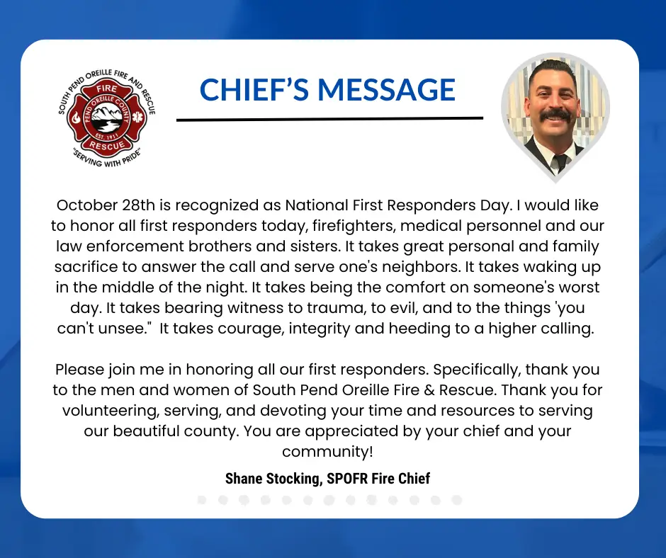 SPOFR is honored to thank all of our veterans for their service, personal sacrifice, and commitment to our country. We are lucky to have many veterans on our team at SPOFR and recognize the large amount that reside within Pend Oreille County. To all who have served, please accept our utmost thanks and appreciation from your fire service family!