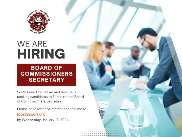 South Pend Oreille Fire & Rescue is hiring Firefighter Paramedics. OPENING MARCH Firefighter/Paramedic 48/96 Schedule Competitive Salary Benefits Aggressive Protocols Please see the Poster for additional details. Interested applicants may obtain an application from the District Office or online at Application (fill-in). Applicants MUST submit a cover letter, and resume along with the application by 5:00 p.m. [...]