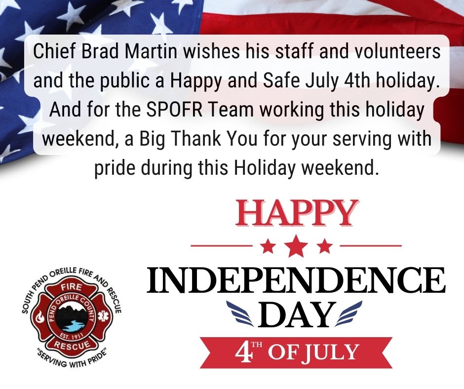 Chief Brad Martin wishes his staff and volunteers and the public a Happy and Safe July 4th holiday. And for the SPOFR Team working this holiday weekend, a Big Thank You for your serving with pride during this Holiday weekend.